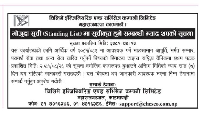 National Competitive Bidding Chilime Engineering and Services Company Limited (ChesCo), a subsidiary company of Chilime Hydropower Company Limited is looking for experienced, organized, dedicated and qualified Nepalese Citizens…