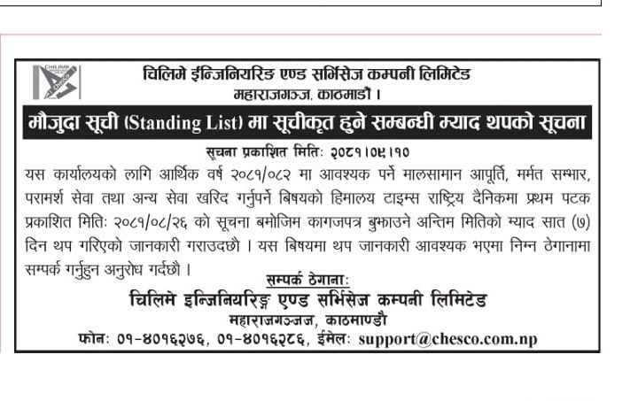synepsolutions 8 months ago मौजुदा सूचीको म्याद थपमौजुदा सूचि (Standing List) मा सूचिकृत हुने सम्बन्धि सूचनामौजुदा सूचीको म्याद थप